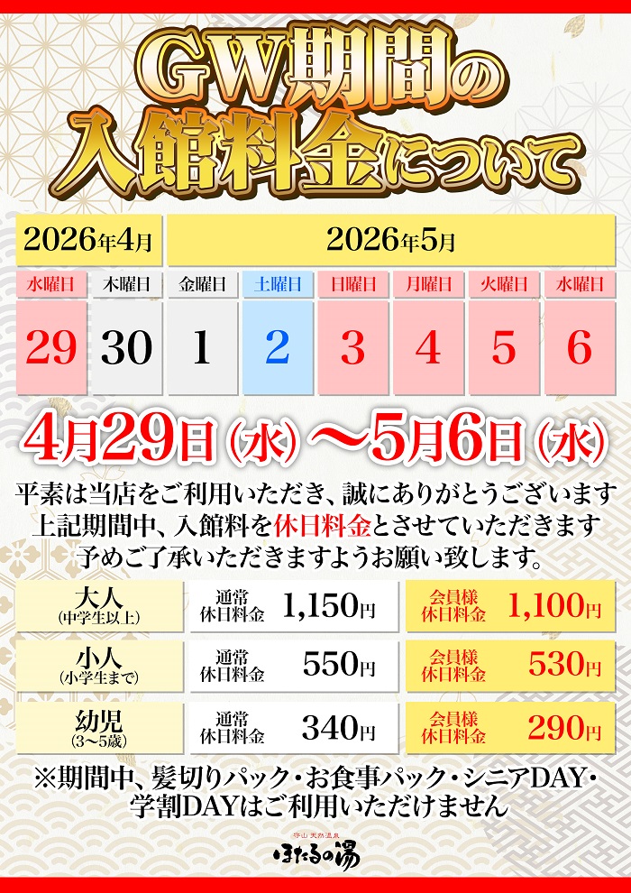 | 施設全体 | 10:00~24:00(最終受付23:30) ※刺青やタトゥー(シールペイント含む) のある方のご利用をお断りしています。 |