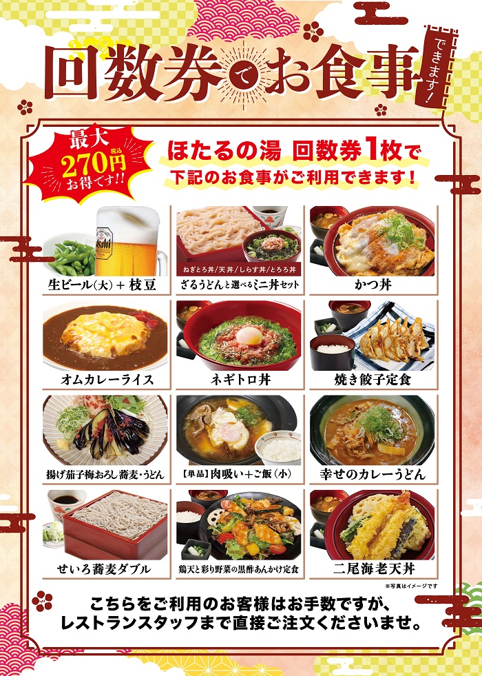 お食事処「ほっこり亭」では、蕎麦、寿司、定食、麺類、丼類、韓国料理など充実したラインナップで、ご飲食をお楽しみいただけます。その他にも、ドリンク、お子様メニュー等種類が豊富となっております。